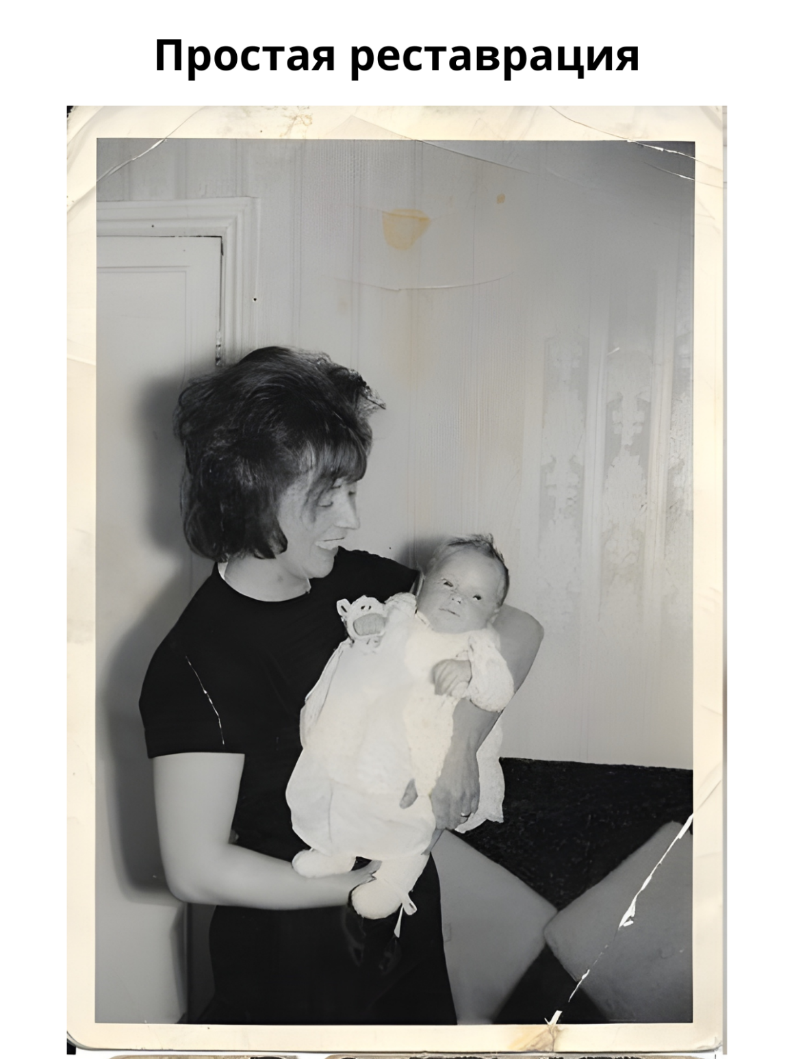 Удаляем трещины и пятна, возвращаем чёткость и цвет, раскрашиваем чёрно-белые снимки. Работаем вручную - без искусственных эффектов нейросетей.